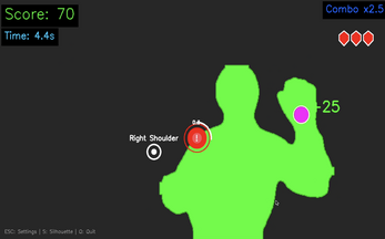 Instructions: Make sure to have a webcam. Select options in the menu by closing your fist. Whatever part of your body is highlighted in purple must touch the white target, while avoiding that any part of your body touches any of the red bombs.